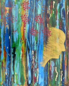 Kleurrijk schilderij geïnspireerd op Moeder Aarde. Gebruik van diverse technieken.