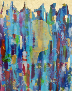 Schilderij in blauw- en groentinten, gecombineerd met goudtint.